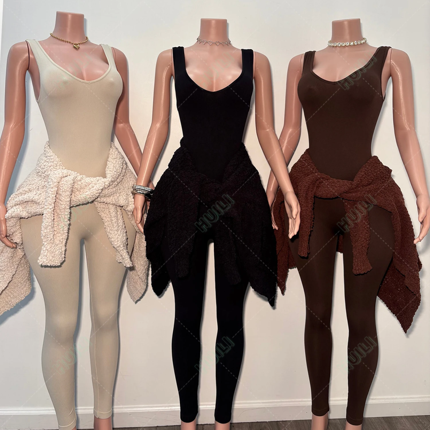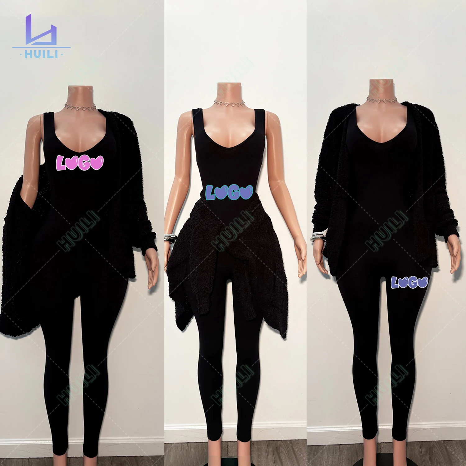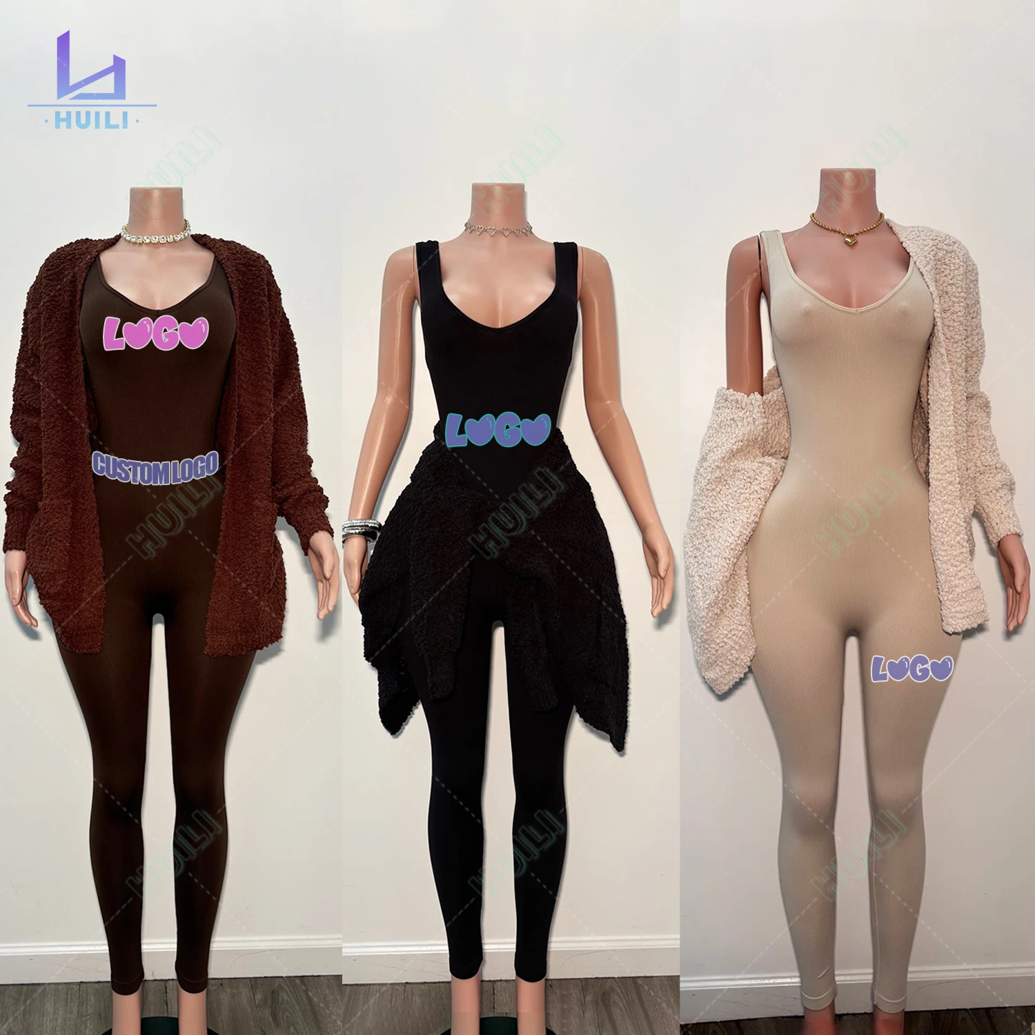 Huili Oem Custom Two Piece Jumpsuit Activewear & Sweater Jacket Gym Sports Leggings Knitted Cardigan Loungewear Sets for Women